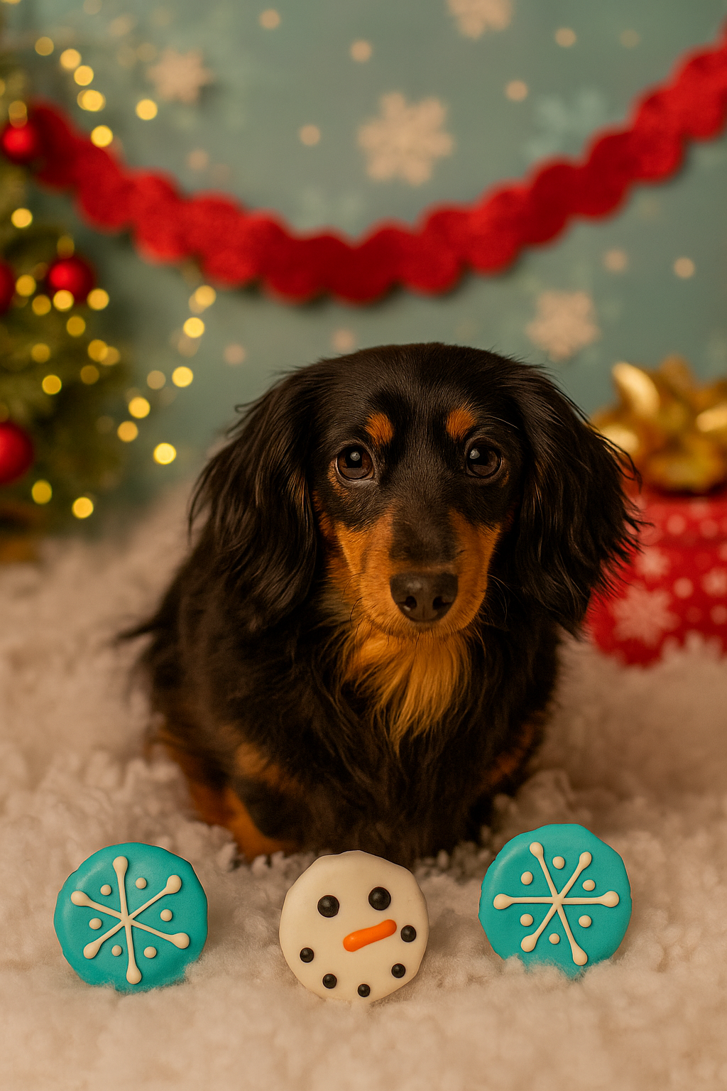 Why Your Dog Will Love It: Inside the gift box, you'll find 3 hand crafted of dog-friendly Christmas-themed cookies —crunchy, mouth-watering and beautifully decorated! The leading round cookie decorated looking like a whimsical Snowman, with 2 additional snowflake cookies. Think of these as your pup's very own Christmas Cookie, baked with care just like the ones you love to indulge in.
